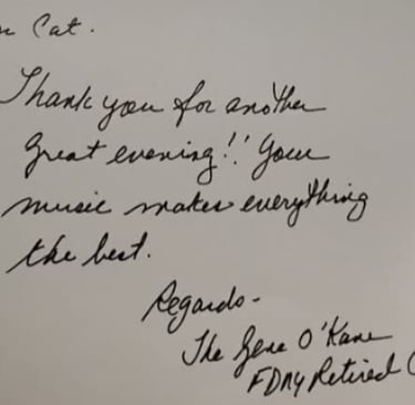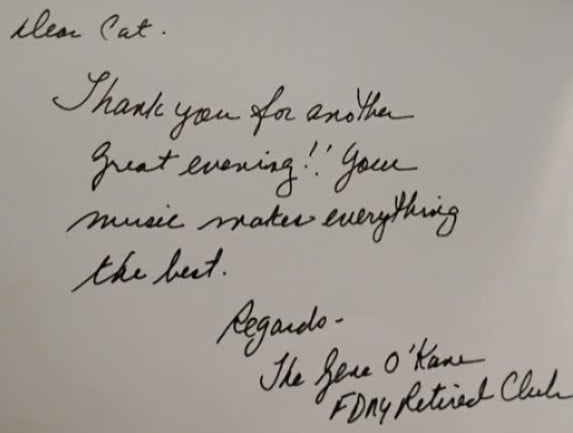 Just wanted to let you know that Cat did a great job on Friday night. After two hours of continuous entertainment, I asked her to take a break and she was very hesitant and said she is used to playing the entire four hour window. We were also impressed with her ability to move through the songs in her set without having to adjust any tracks on her sound equipment. Bottom line she is a very professional hard working lady and it was a pleasure to have her at Quail Hollow.